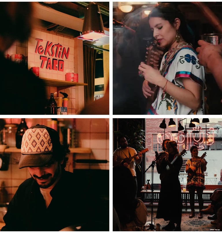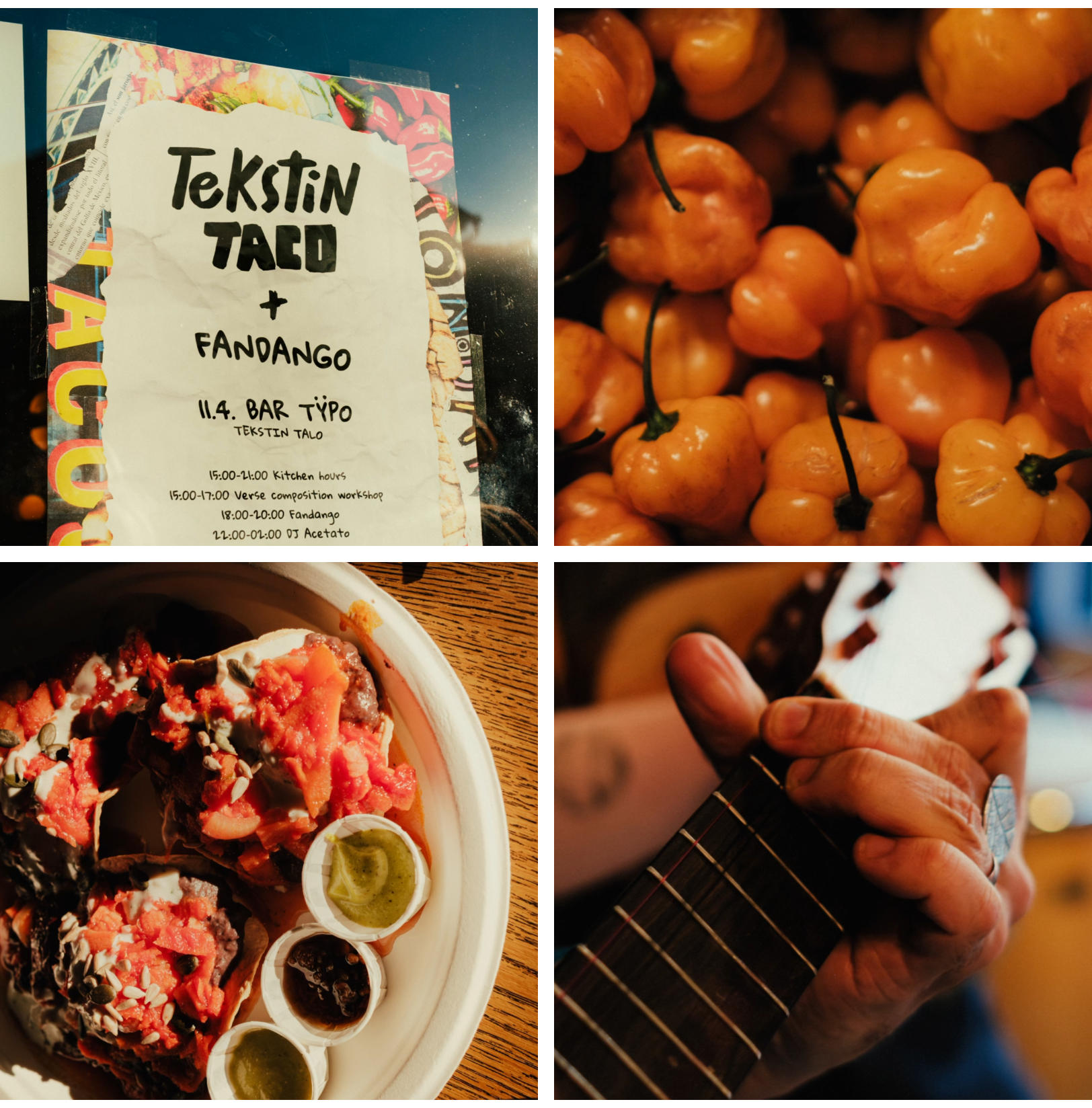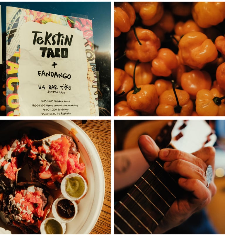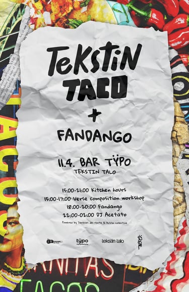 Tekstin Taco and Fandango is a monthly event at Bar Typo in Tekstin Talo in Helsinki, where music, dancing, and food come together in a communal celebration. The food is a blend of Mexican and Finnish cuisine.